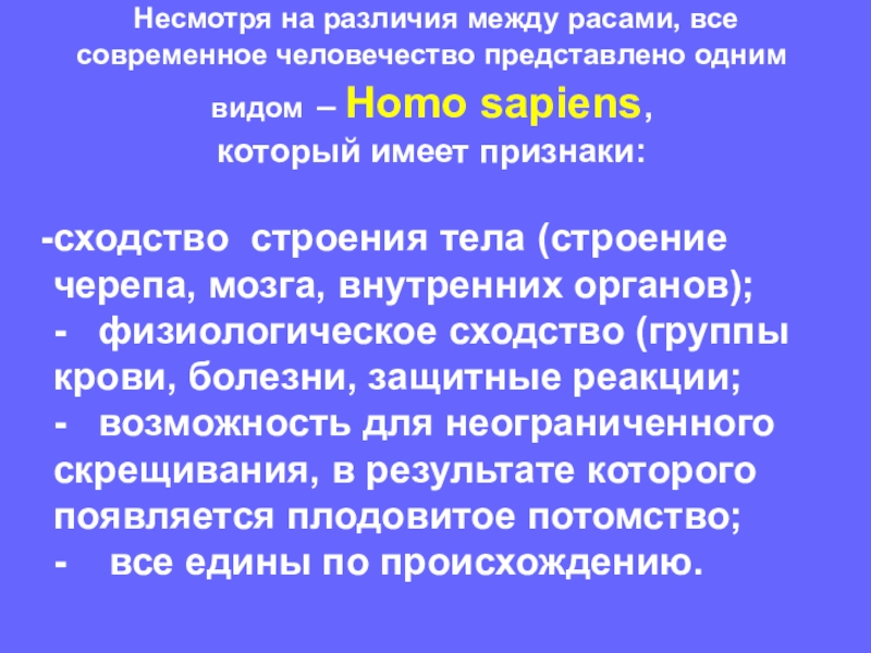 Несмотря на различия между расами, все современное человечество представлено одним видом – Homo sapiens,