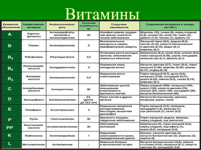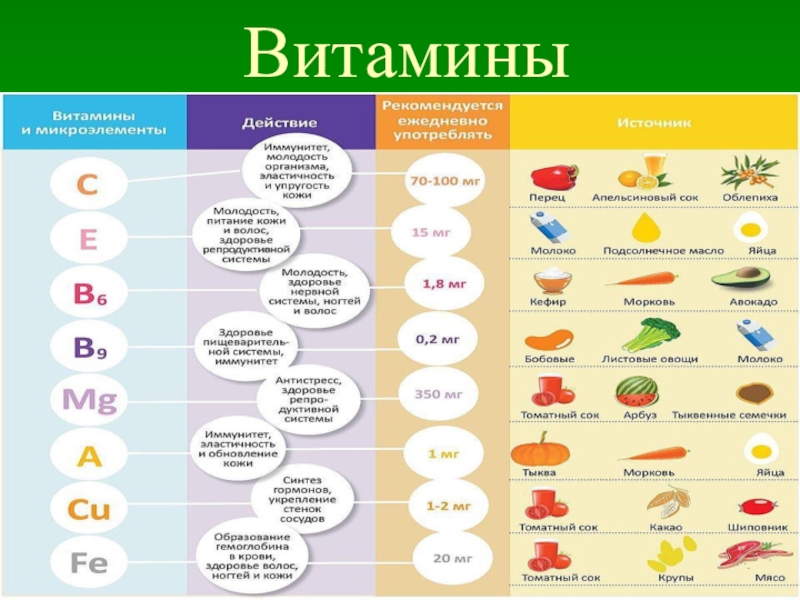 Железо (субпродукты, нежирное мясо, яичный желток, зелень) – 15 мг.