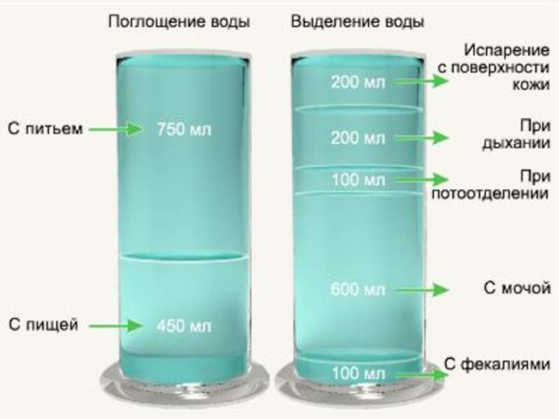 может существовать без воды. Вода - часть тканей человеческого тела. Основные процессы, продолжающиеся в организме, связаны с водным присутствием, с растворением материалами в ней. Было установлено, что в целом количество воды, полученной человеком с едой и питьем, является в среднем равными 2-2,5 литра. Превышение нормы пробуждает усиленную работу сердца и почек; кроме того, минеральные вещества и некоторые витамины удаляются с водой. Поэтому не используйте воды больше, чем это необходимо для организма.