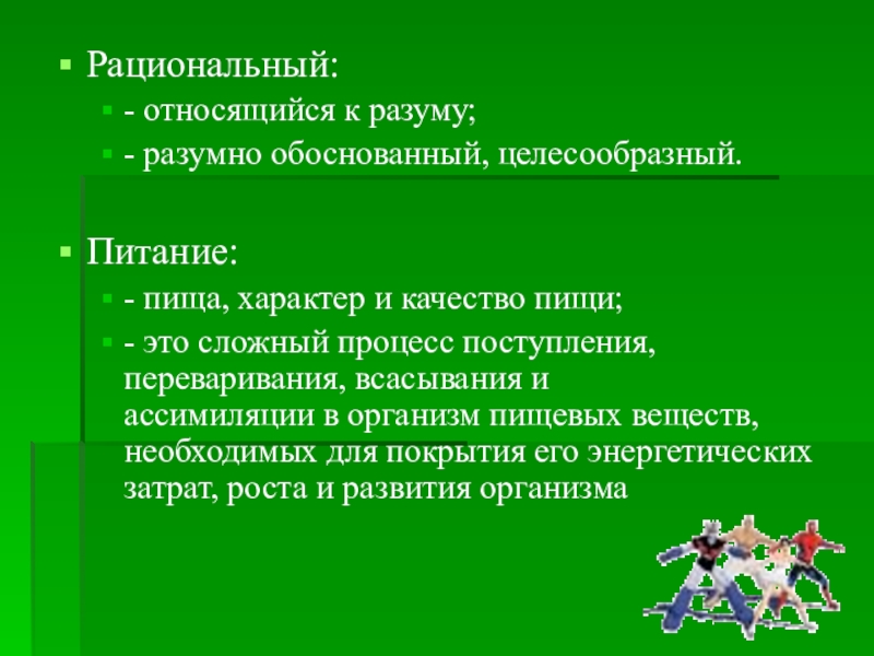 - это сложный процесс поступления, переваривания, всасывания и ассимиляции в организм пищевых веществ, необходимых для покрытия его энергетических затрат, роста и развития организма