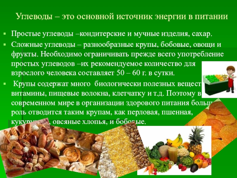 Сложные углеводы – разнообразные крупы, бобовые, овощи и фрукты. Необходимо ограничивать прежде всего употребление простых углеводов –их рекомендуемое количество для взрослого человека составляет 50 – 60 г. в сутки.
