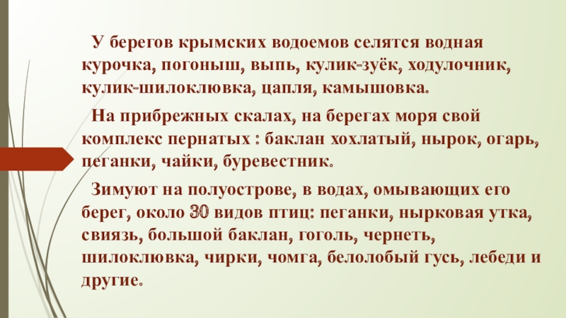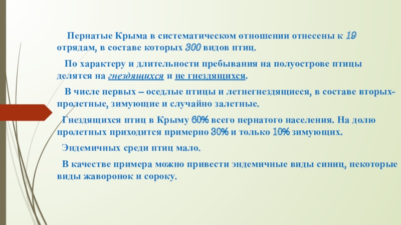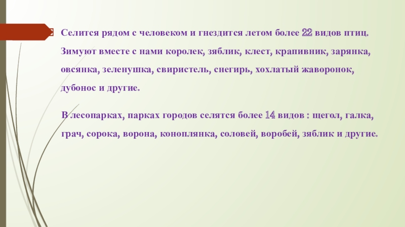 В лесопарках, парках городов селятся более 14 видов : щегол, галка, грач, сорока, ворона, коноплянка, соловей, воробей, зяблик и другие.