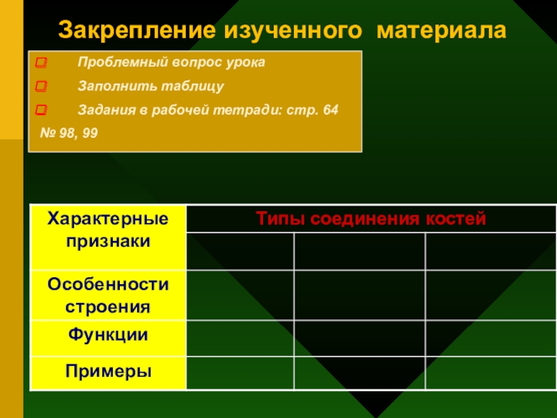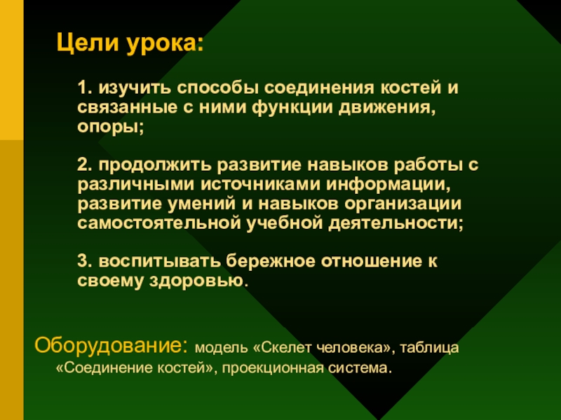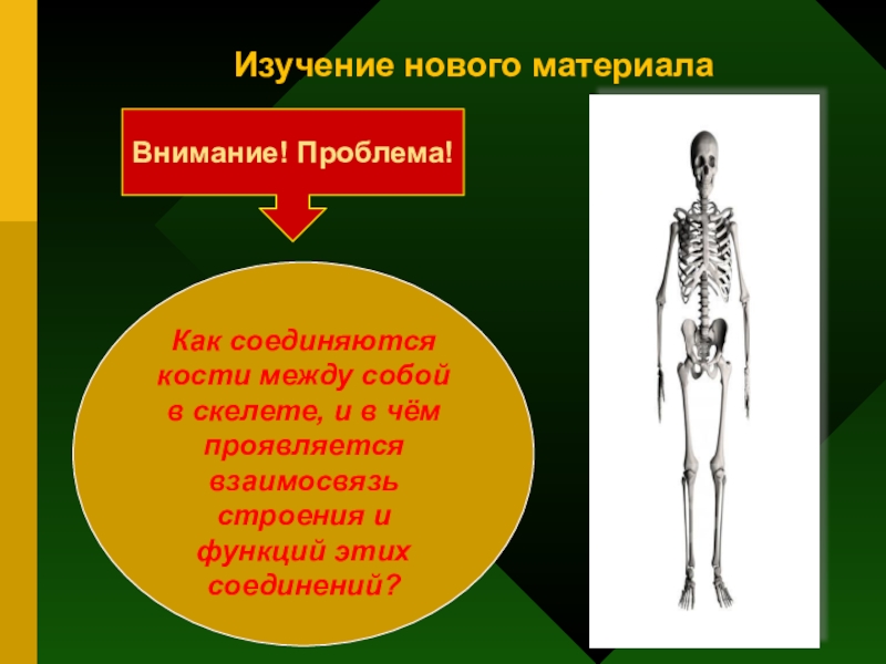 Оборудование: модель «Скелет человека», таблица «Соединение костей», проекционная система.