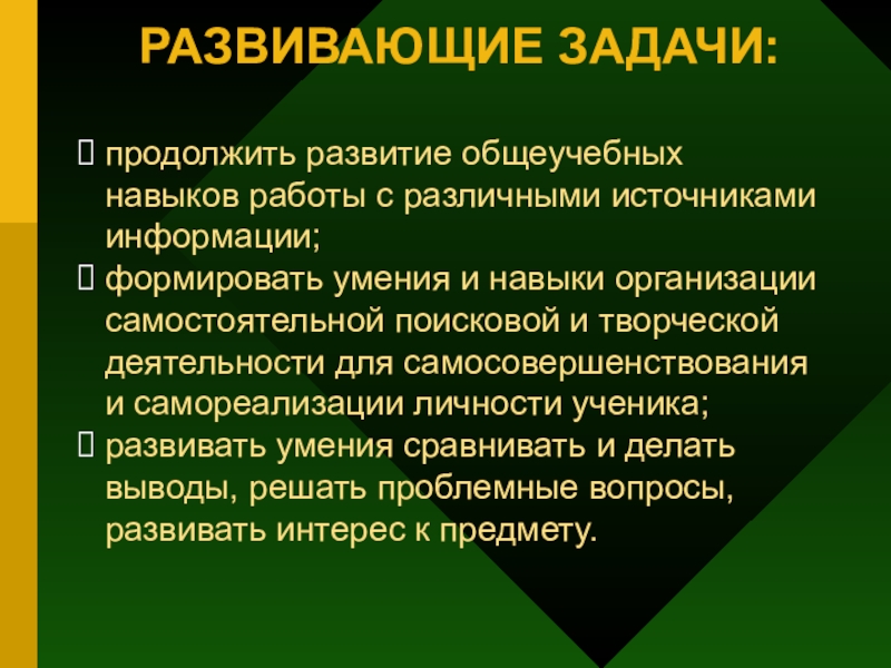 2. продолжить развитие навыков работы с различными источниками информации, развитие умений и навыков организации самостоятельной учебной деятельности;