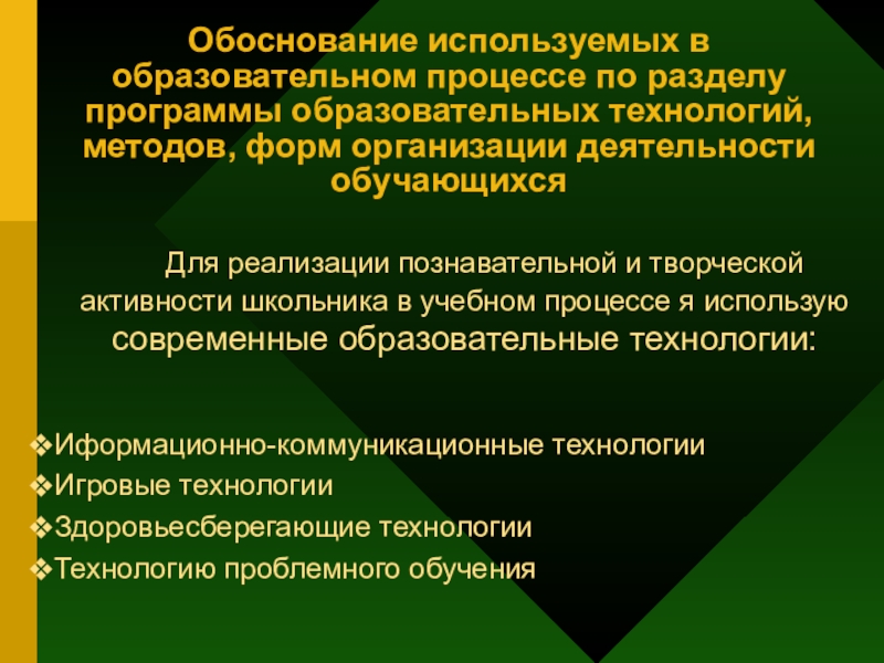 Для реализации познавательной и творческой активности школьника в учебном процессе я использую современные образовательные технологии: