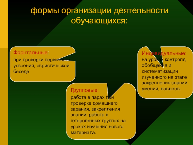 Индивидуальные: на уроках контроля, обобщения и систематизации изученного на этапе закрепления знаний, умений, навыков.