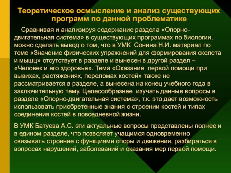 и анализируя содержание раздела «Опорно-двигательная система» в существующих программах по биологии, можно сделать вывод о том, что в УМК Сонина Н.И. материал по теме «Значение физических упражнений для формирования скелета и мышц» отсутствует в разделе и вынесен в другой раздел – «Человек и его здоровье». Тема «Оказание первой помощи при вывихах, растяжениях, переломах костей» также не рассматривается в разделе, а вынесена на конец учебного года в заключительную тему. Целесообразнее изучать данные вопросы в разделе «Опорно-двигательная система», т.к. это дает возможность использовать приобретенные знания о строении костей и типах соединения костей в повседневной жизни.