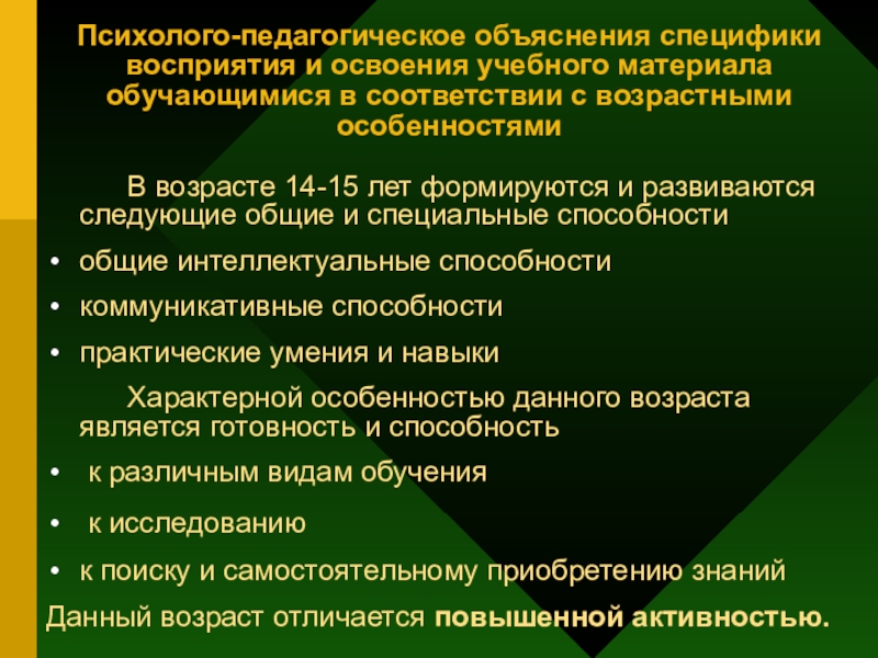В возрасте 14-15 лет формируются и развиваются следующие общие и специальные способности