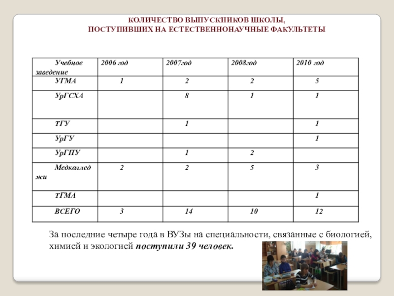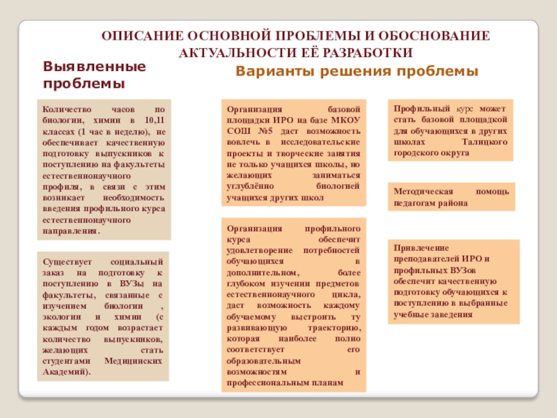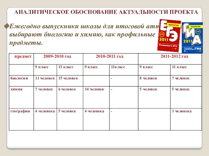 Существует социальный заказ на подготовку к поступлению в ВУЗы на факультеты, связанные с изучением биологии , экологии и химии (с каждым годом возрастает количество выпускников, желающих стать студентами Медицинских Академий).
