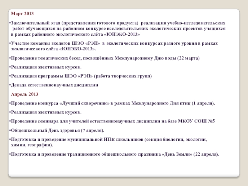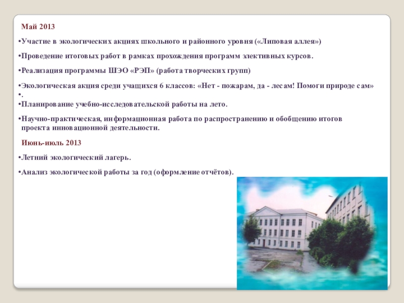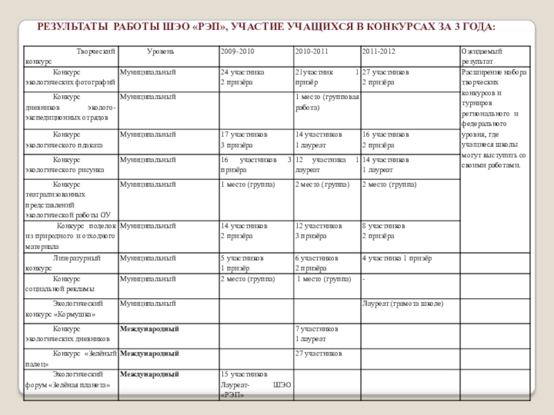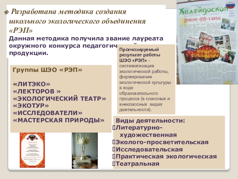 Прогнозируемый результат работы ШЭО «РЭП» - систематизация экологической работы, формирование экологической культуры в ходе образовательного процесса (в классных и внеклассных видах деятельности).