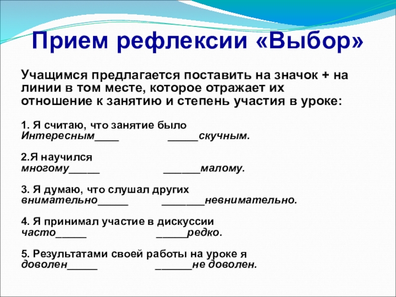 Прием рефлексии «Выбор»Учащимся предлагается поставить на значок + на линии в том месте, которое отражает их отношение