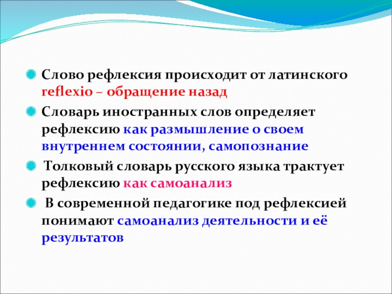 Слово рефлексия происходит от латинского reflexio – обращение назадСловарь иностранных слов определяет рефлексию как размышление о своем внутреннем состоянии, самопознание Толковый словарь русского языка трактует рефлексию как самоанализ В современной педагогике под рефлексией понимают самоанализ деятельности