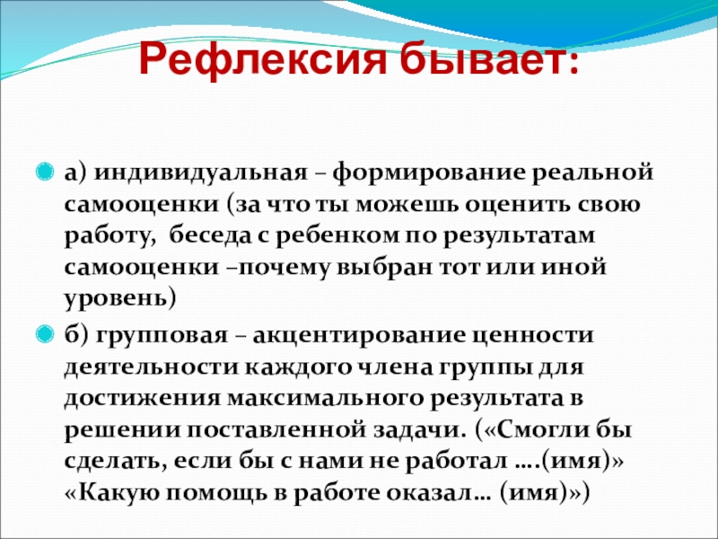 Рефлексия бывает: а) индивидуальная – формирование реальной самооценки (за что ты можешь оценить свою работу, беседа с