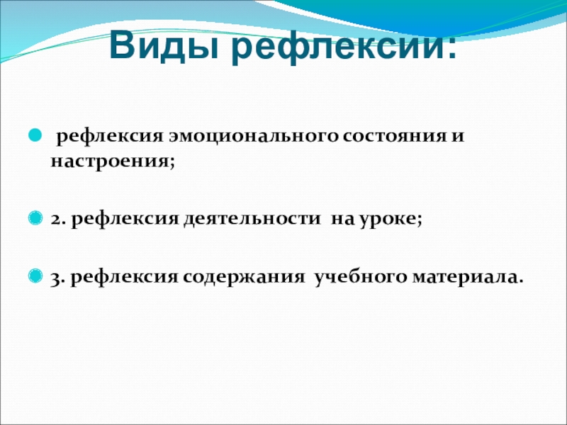 Виды рефлексии:  рефлексия эмоционального состояния и настроения;2. рефлексия деятельности на уроке;3. рефлексия содержания учебного материала.