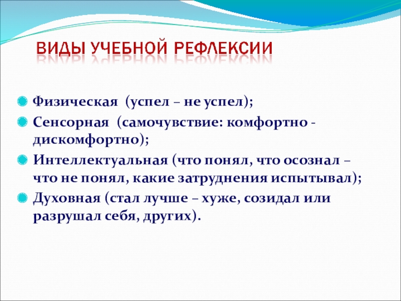 Физическая (успел – не успел);Сенсорная (самочувствие: комфортно - дискомфортно);Интеллектуальная (что понял, что осознал – что не понял,