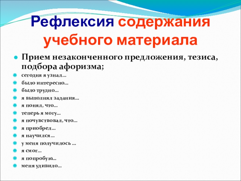 Рефлексия содержания учебного материалаПрием незаконченного предложения, тезиса, подбора афоризма;сегодня я узнал…было интересно…было трудно…я выполнял задания…я понял, что…теперь