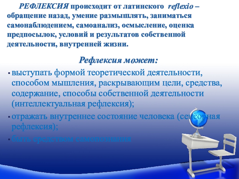 РЕФЛЕКСИЯ происходит от латинского reflexio – обращение назад, умение размышлять, заниматься самонаблюдением, самоанализ, осмысление, оценка предпосылок, условий и результатов собственной деятельности, внутренней жизни.