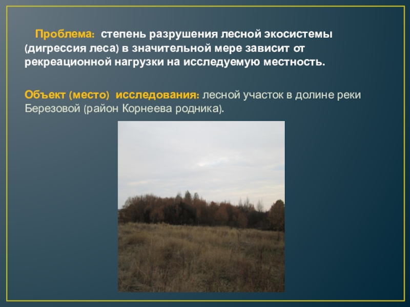 Объект (место) исследования: лесной участок в долине реки Березовой (район Корнеева родника).
