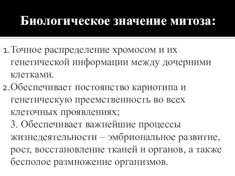 3. Обеспечивает важнейшие процессы жизнедеятельности – эмбриональное развитие, рост, восстановление тканей и органов, а также бесполое размножение организмов.