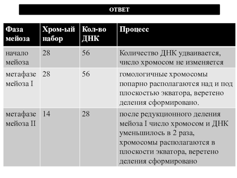 3) Во втором делении мейоза расходятся хроматиды, поэтому в конце телофазы 2 мейоза хромосомный набор в клетках одинарный (п)-7 хромосом, число молекул ДНК равно одному-7 (1с).