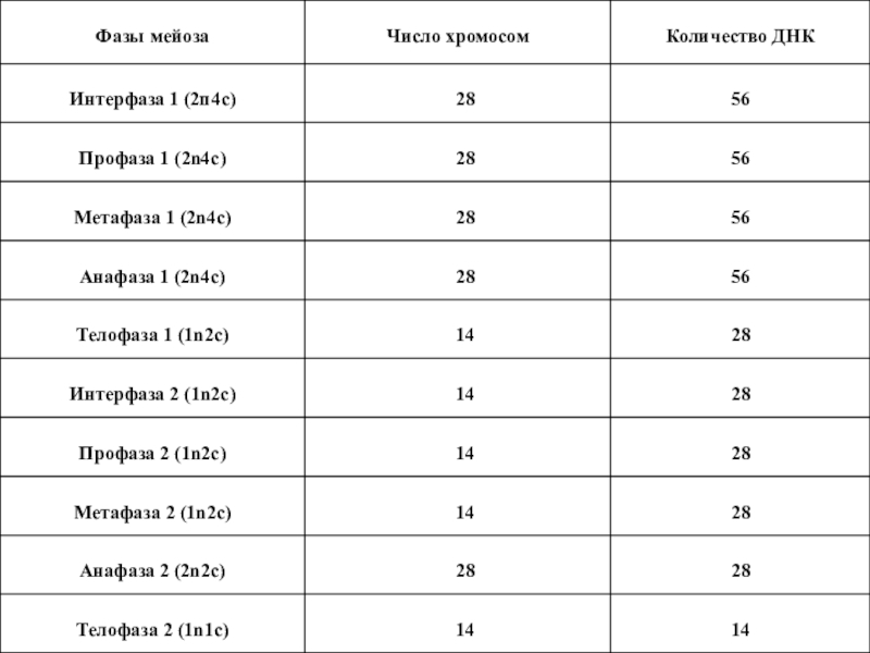 в одинарном наборе (п) равно 7хромосомам. Перед началом мейоза хромосомный набор в клетках двойной(2п) из 14 хромосом, в интерфазе происходит удвоение молекул ДНК, поэтому число молекул ДНК- 28 (4с).