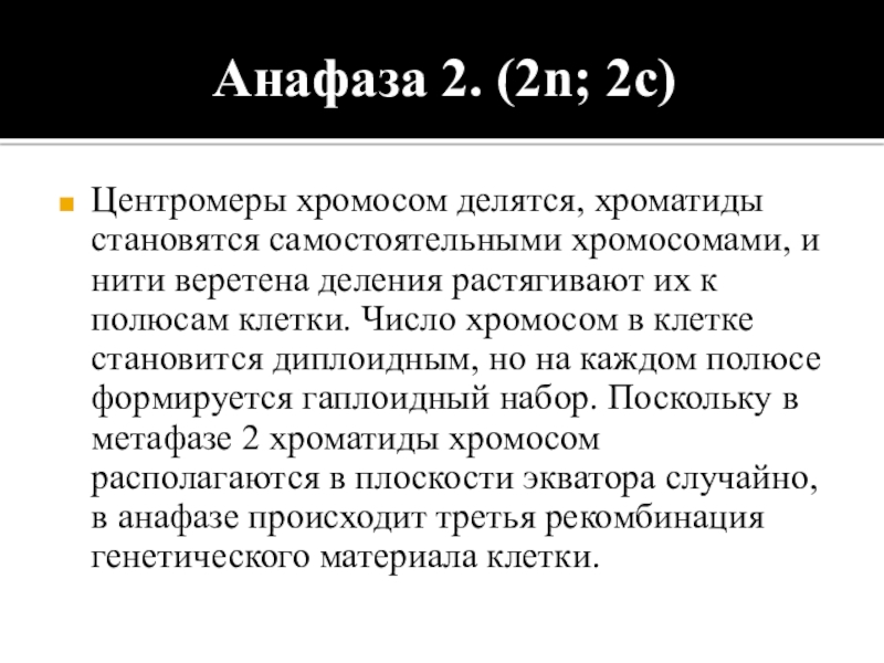 и нити веретена деления растягивают их к полюсам клетки. Число хромосом в клетке становится диплоидным, но на каждом полюсе формируется гаплоидный набор. Поскольку в метафазе 2 хроматиды хромосом располагаются в плоскости экватора случайно, в анафазе происходит третья рекомбинация генетического материала клетки.