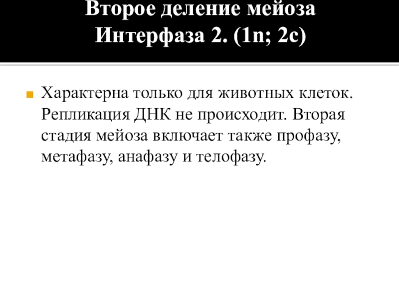 Репликация ДНК не происходит. Вторая стадия мейоза включает также профазу, метафазу, анафазу и телофазу.