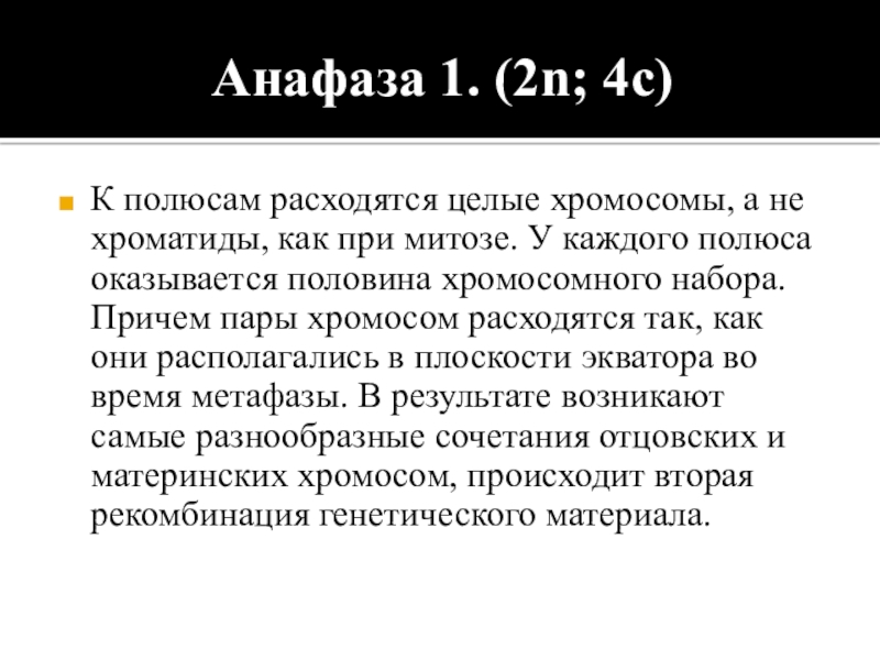 хроматиды, как при митозе. У каждого полюса оказывается половина хромосомного набора. Причем пары хромосом расходятся так, как они располагались в плоскости экватора во время метафазы. В результате возникают самые разнообразные сочетания отцовских и материнских хромосом, происходит вторая рекомбинация генетического материала.