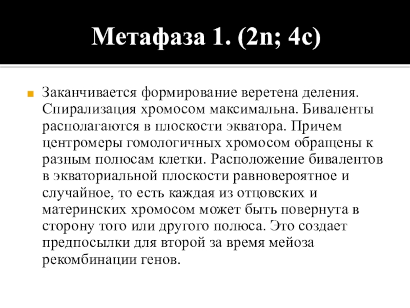 Биваленты располагаются в плоскости экватора. Причем центромеры гомологичных хромосом обращены к разным полюсам клетки. Расположение бивалентов в экваториальной плоскости равновероятное и случайное, то есть каждая из отцовских и материнских хромосом может быть повернута в сторону того или другого полюса. Это создает предпосылки для второй за время мейоза рекомбинации генов.