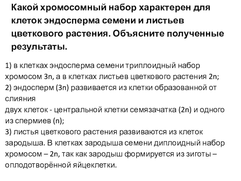 Слайд 17Какой хромосомный набор характерен для клеток эндосперма семени и листьев цветкового