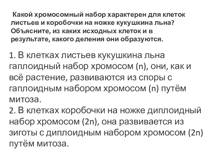 Слайд 9 Какой хромосомный набор характерен для клеток листьев и коробочки на ножке