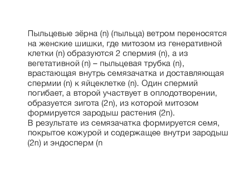 Слайд 5Пыльцевые зёрна (n) (пыльца) ветром переносятся на женские шишки, где митозом