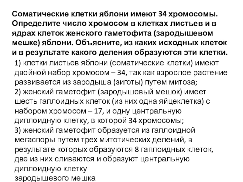 Слайд 13Соматические клетки яблони имеют 34 хромосомы. Определите число хромосом в клетках