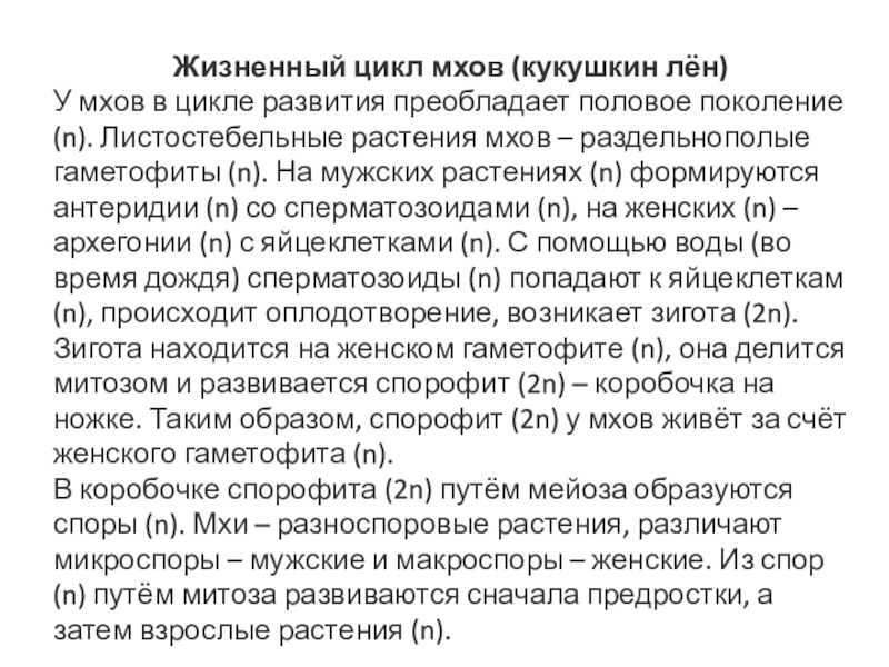 У мхов в цикле развития преобладает половое поколение (n). Листостебельные растения мхов – раздельнополые гаметофиты (n). На мужских растениях (n) формируются антеридии (n) со сперматозоидами (n), на женских (n) – архегонии (n) с яйцеклетками (n). С помощью воды (во время дождя) сперматозоиды (n) попадают к яйцеклеткам (n), происходит оплодотворение, возникает зигота (2n). Зигота находится на женском гаметофите (n), она делится митозом и развивается спорофит (2n) – коробочка на ножке. Таким образом, спорофит (2n) у мхов живёт за счёт женского гаметофита (n).