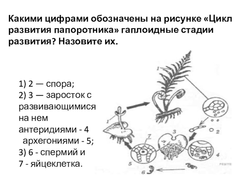 Слайд 15Какими цифрами обозначены на рисунке «Цикл развития папоротника» гаплоидные стадии развития?