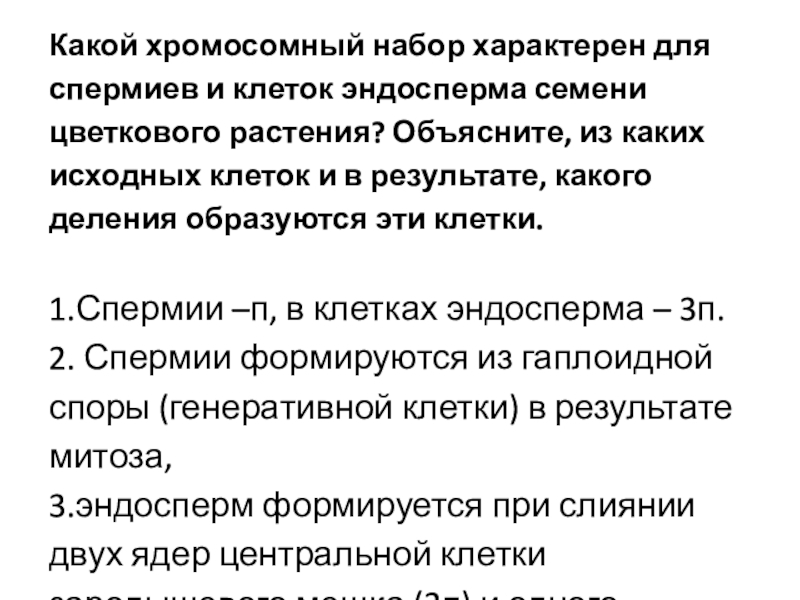 Слайд 19Какой хромосомный набор характерен для спермиев и клеток эндосперма семени цветкового