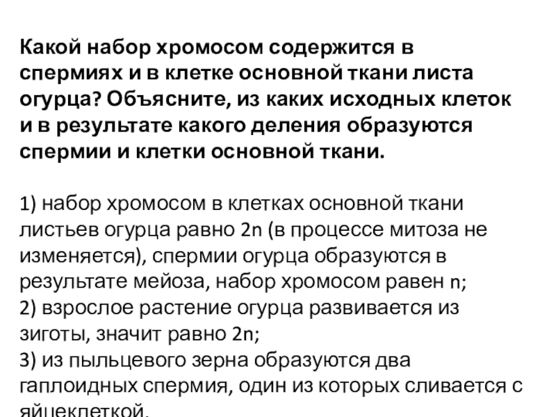 1) набор хромосом в клетках основной ткани листьев огурца равно 2n (в процессе митоза не изменяется), спермии огурца образуются в результате мейоза, набор хромосом равен n;