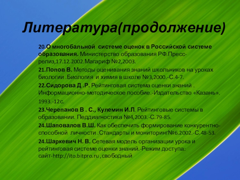24.Шаркевич Н. В. Сетевая модель организации урока и рейтинговая системе оценки знаний.-Режим доступа: сайт-http://ito.bitpro.ru ,свободный