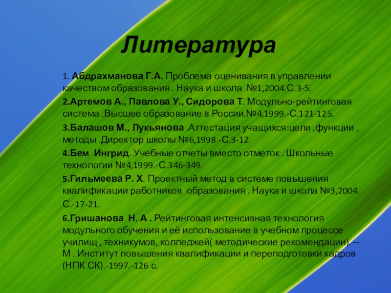 1. Абдрахманова Г.А. Проблема оценивания в управлении качеством образования . Наука