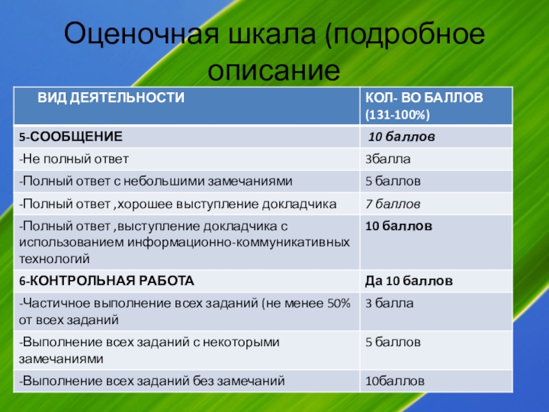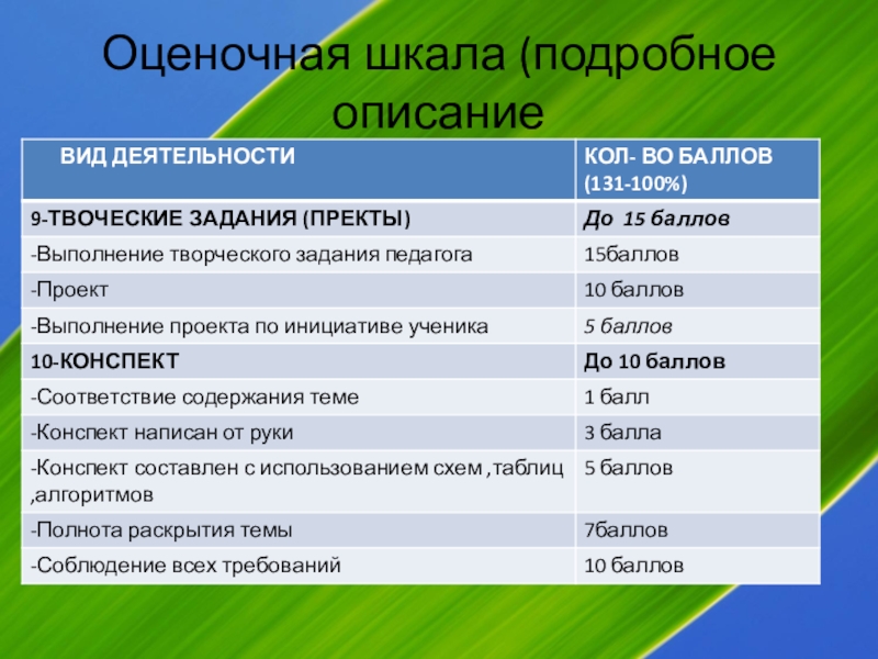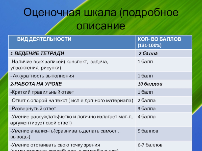 учителя и ученика .Подсчет максимально возможного количества баллов производится ,исходя из количества занятий ,путем суммирования баллов. Количество баллов ,необходимое для получения «5»-80% от максимально возможного