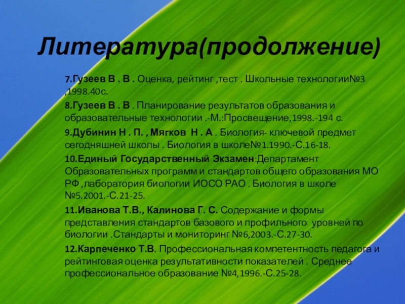 10.Единый Государственный Экзамен:Департамент Образовательных программ и стандартов общего образования МО РФ ,лаборатория биологии ИОСО РАО . Биология в школе №5.2001.-С.21-25.