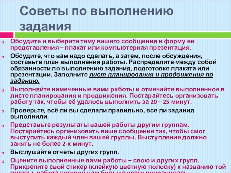 Обсудите, что вам надо сделать, а затем, после обсуждения, составьте план выполнения работы. Распределите между собой обязанности по выполнению задания, подготовке плаката или презентации. Заполните лист планирования и продвижения по заданию.