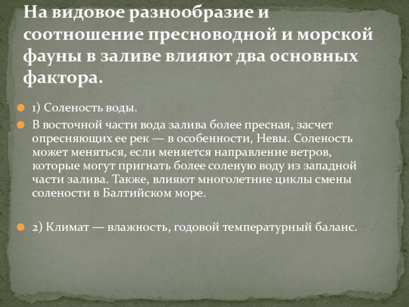 На видовое разнообразие и соотношение пресноводной и морской фауны в заливе влияют два основных фактора.