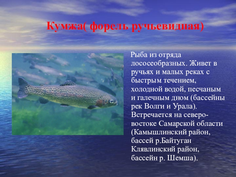Рыба из отряда лососеобразных. Живет в ручьях и малых реках с быстрым течением, холодной водой, песчаным и галечным дном (бассейны рек Волги и Урала). Встречается на северо-востоке Самарской области(Камышлинский район, бассей р.Байтуган Клявлинский район, бассейн р. Шемша).