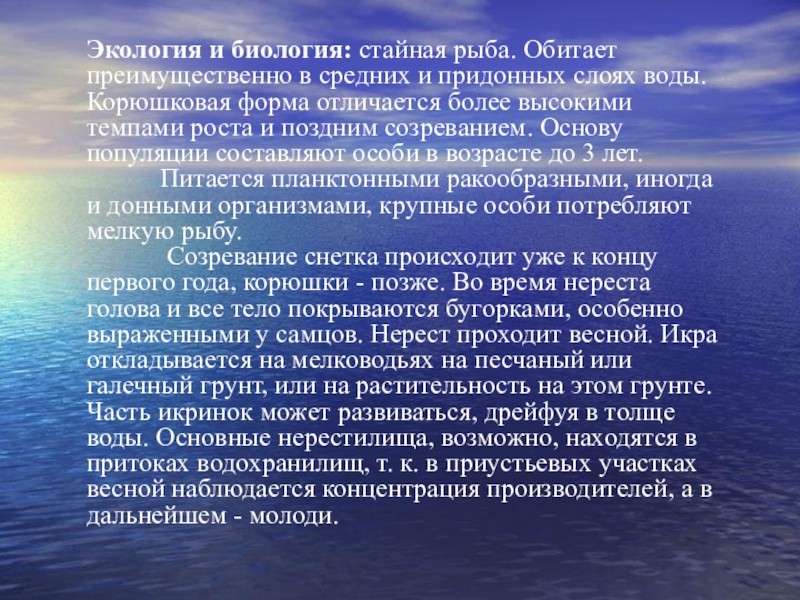 Слайд 7Экология и биология: стайная рыба. Обитает преимущественно в средних и придонных