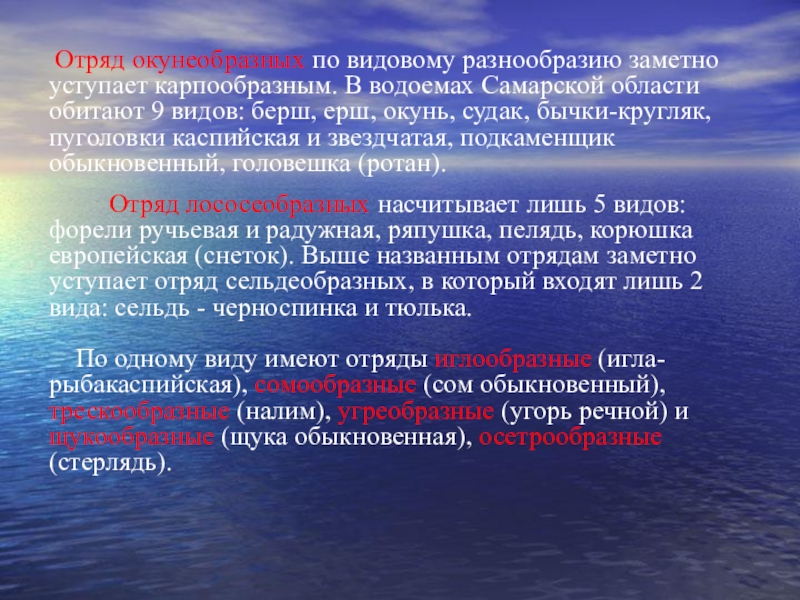 Слайд 3 Отряд окунеобразных по видовому разнообразию заметно уступает карпообразным. В водоемах