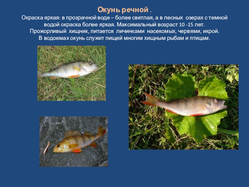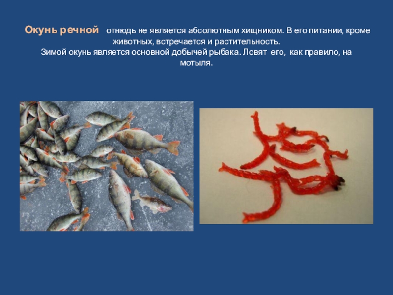 Слайд 12Окунь речной отнюдь не является абсолютным хищником. В его питании,