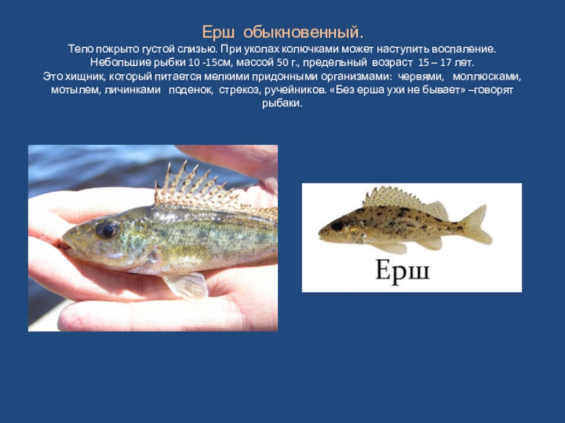 Это хищник, который питается мелкими придонными организмами: червями, моллюсками, мотылем, личинками поденок, стрекоз, ручейников. «Без ерша ухи не бывает» –говорят рыбаки.
