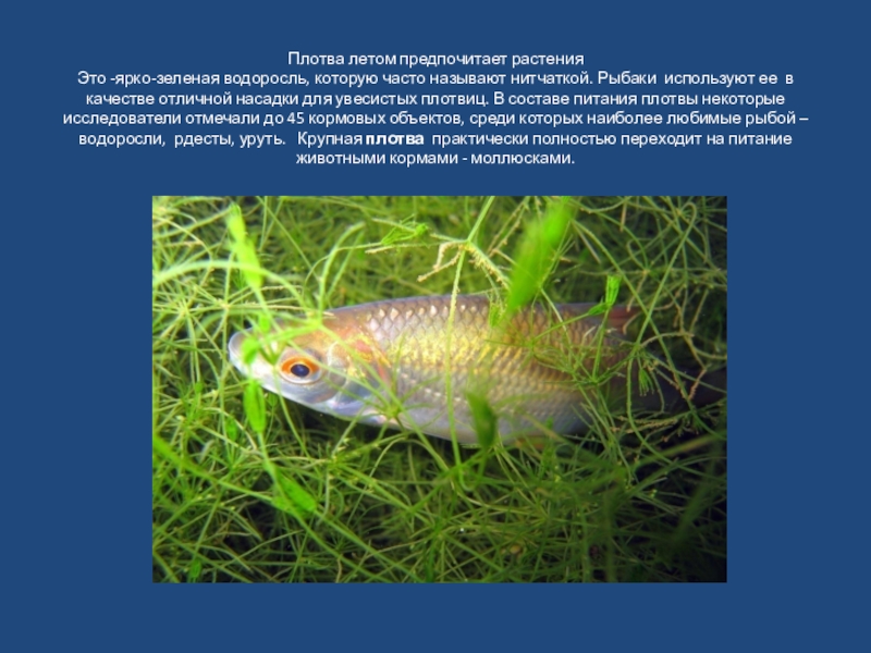 используют ее в качестве отличной насадки для увесистых плотвиц. В составе питания плотвы некоторые исследователи отмечали до 45 кормовых объектов, среди которых наиболее любимые рыбой – водоросли, рдесты, уруть. Крупная плотва практически полностью переходит на питание животными кормами - моллюсками.