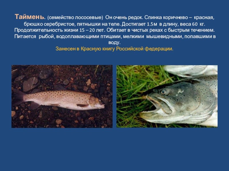 Слайд 16Таймень. (семейство лососевые) Он очень редок. Спинка коричнево – красная, брюшко